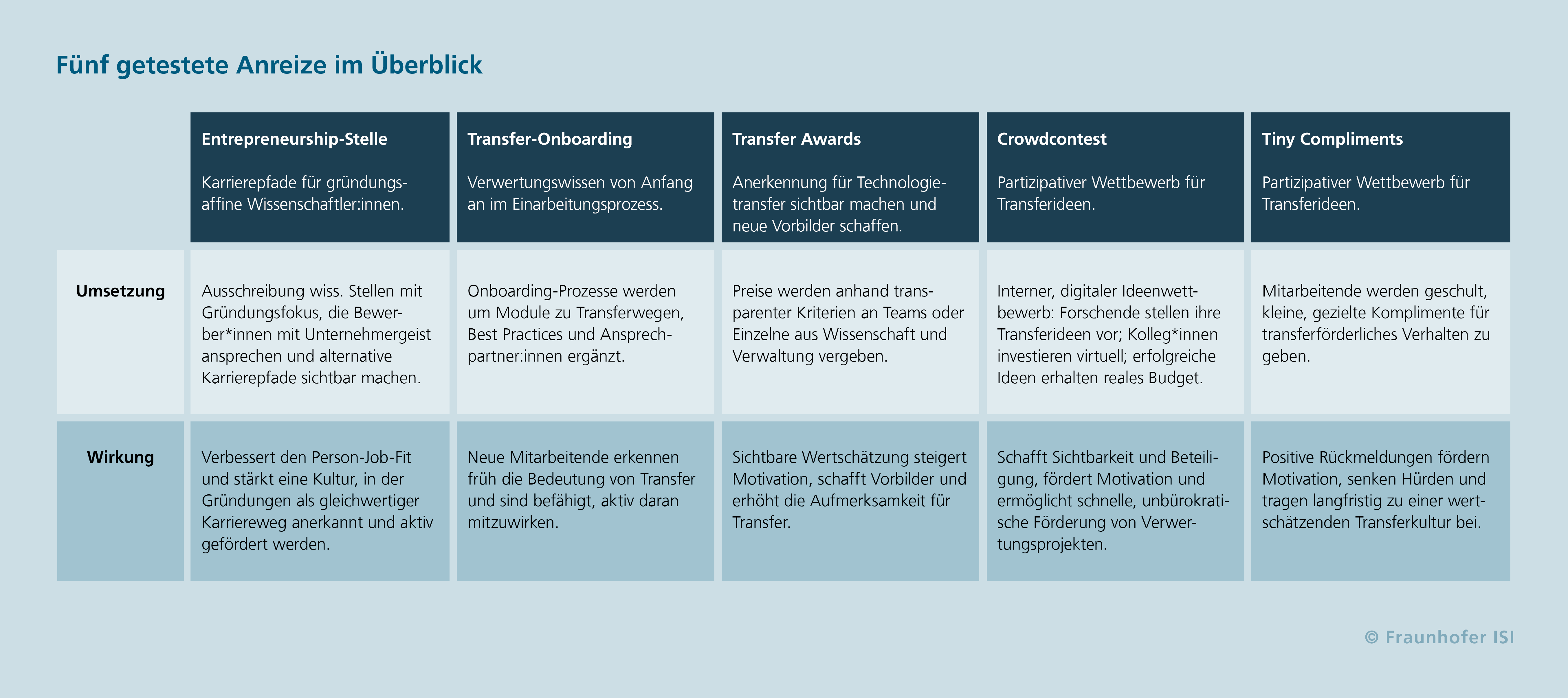 Die Erprobung der fünf Anreizformate hat gezeigt: Wirkungsvolle Veränderungen entstehen nicht nur durch große Programme, sondern oft durch kleine, gezielte Impulse. Schon etwas so Alltägliches wie ein „kleines Kompliment“ kann helfen, Transfer sichtbar zu machen und eine Kultur der Wertschätzung aufzubauen – gerade dort, wo Transfer bislang als Nebensache galt.